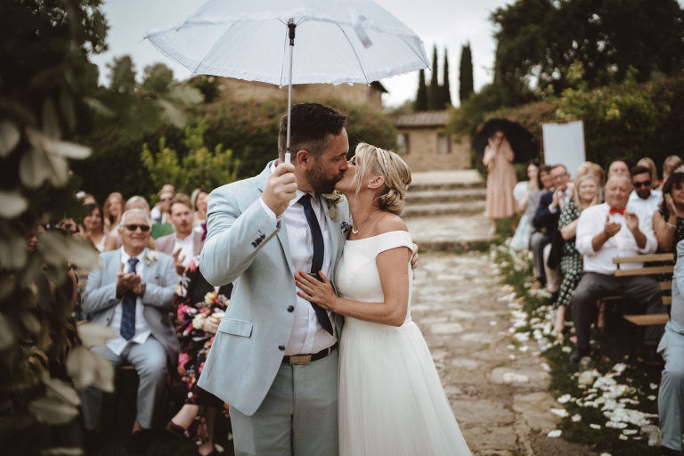 As they shared their first kiss as husband and wife, the rain started to ease up, as if the sky was smiling down on their love.