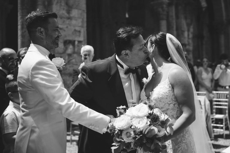 The setting couldn’t have been more enchanting. San Galgano Abbey, with its centuries-old walls and open-air structure, provided a breathtaking backdrop for this beautiful union. Despite the challenging lighting conditions, the ceremony was captured in my own style and every moment immortalized in a cascade of emotions.