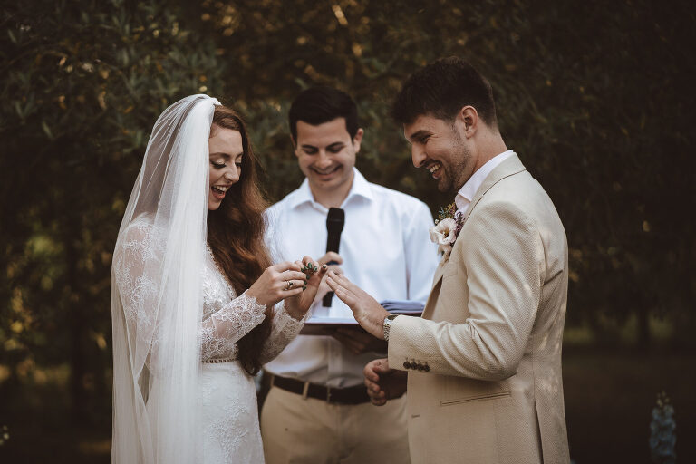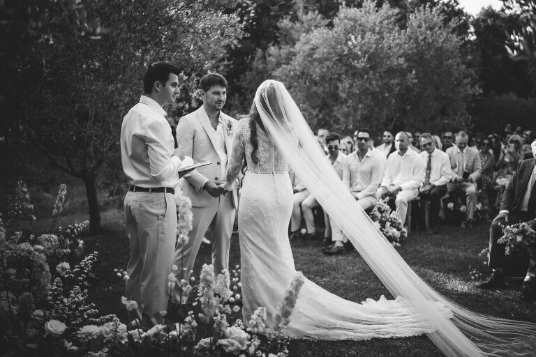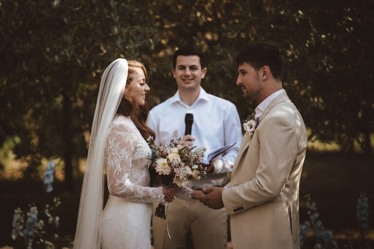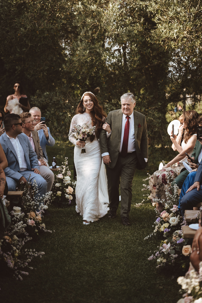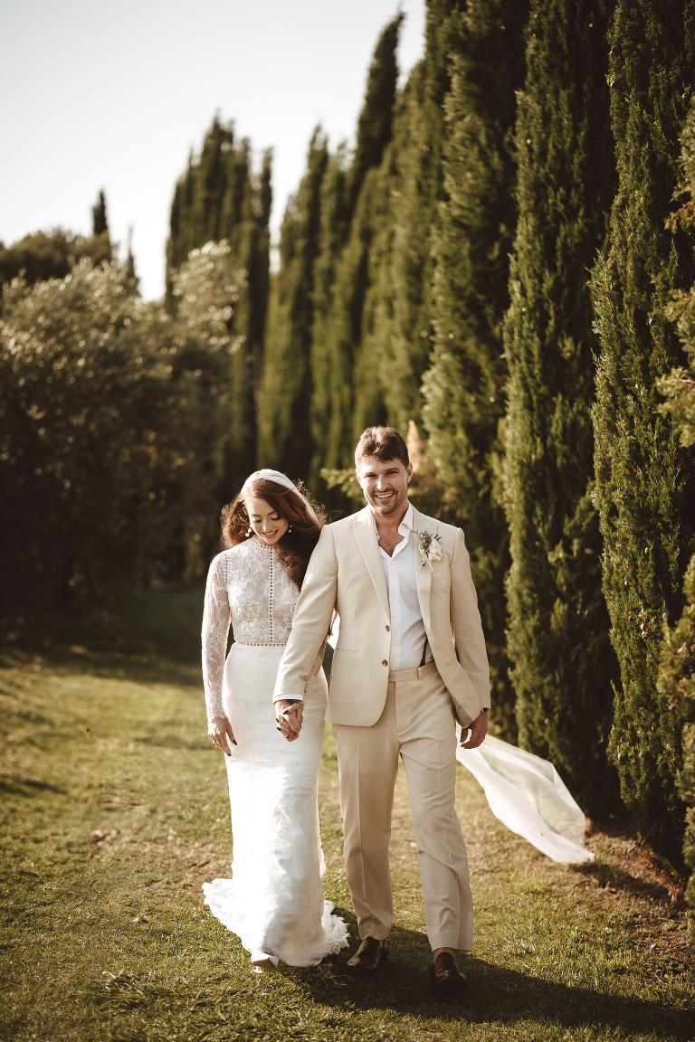 The bride, with her striking long red hair and a flowing gown that seemed made for the Tuscan breeze, was a vision of elegance. The groom complemented her beautifully in a cream suit that added a touch of timeless sophistication. Together, they looked like they had stepped out of a romantic painting, perfectly at home amidst the rolling hills and golden fields of Tuscany.