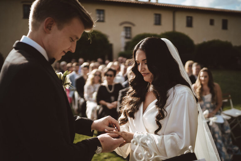 The ceremony took place on the stunning terrace at Borgo Divino, overlooking the breathtaking Tuscan countryside. With golden sunlight filtering through the clouds and a soft breeze carrying the scent of blooming flowers, the atmosphere was nothing short of magical. The couple, glowing with happiness, exchanged vows in front of an intimate gathering of loved ones. Their baby daughter, only a few months old, added a touch of sweetness to the day as she was cradled in their arms, a symbol of their growing family.