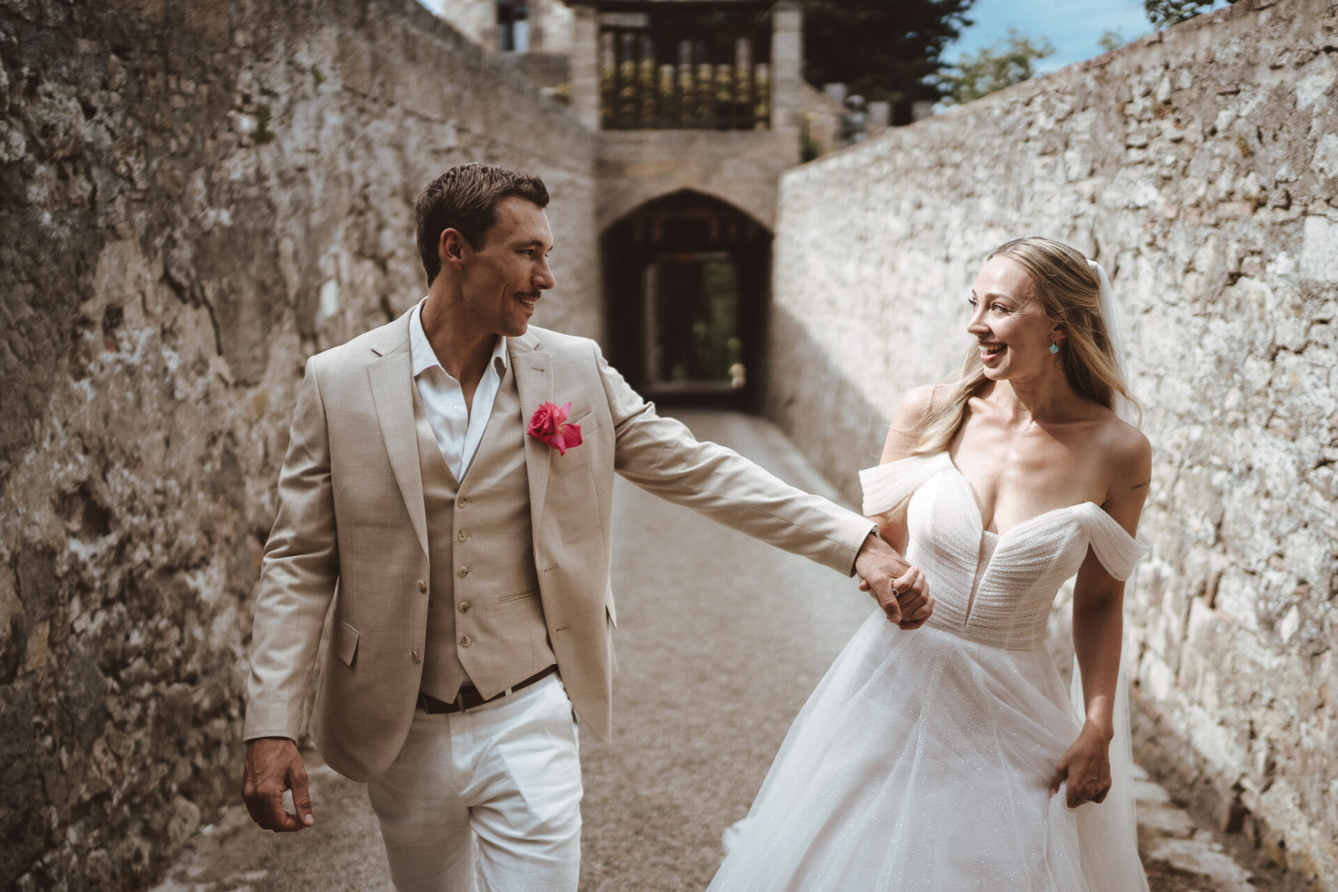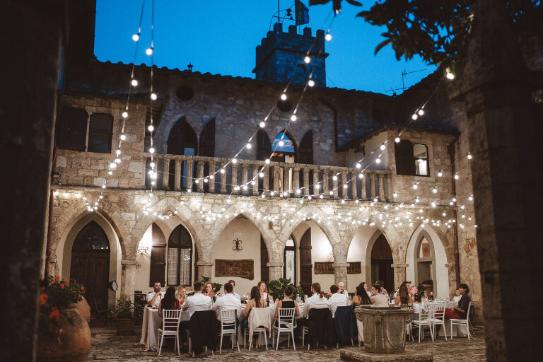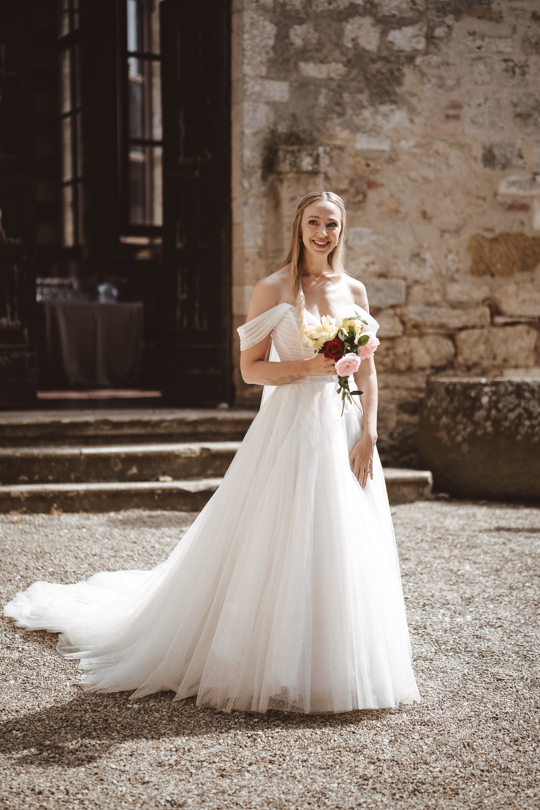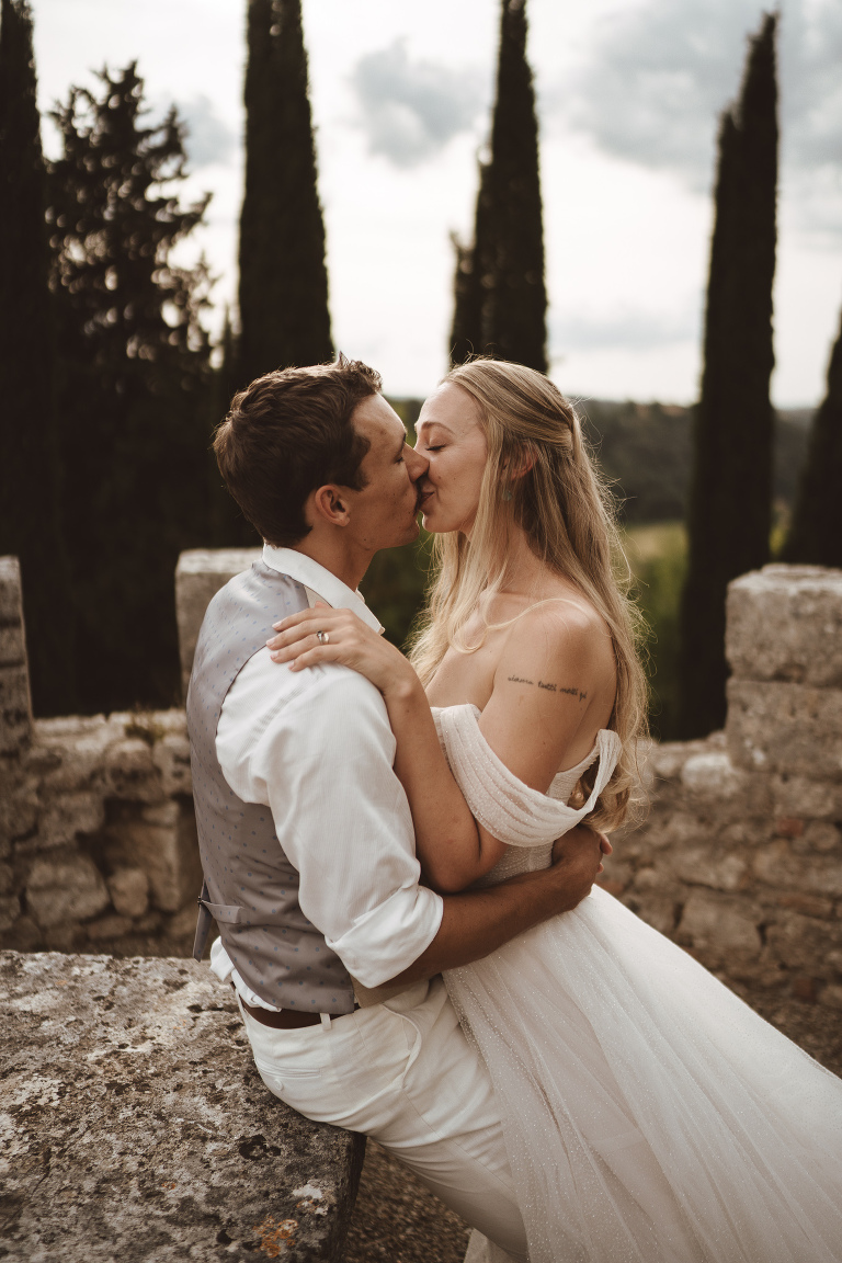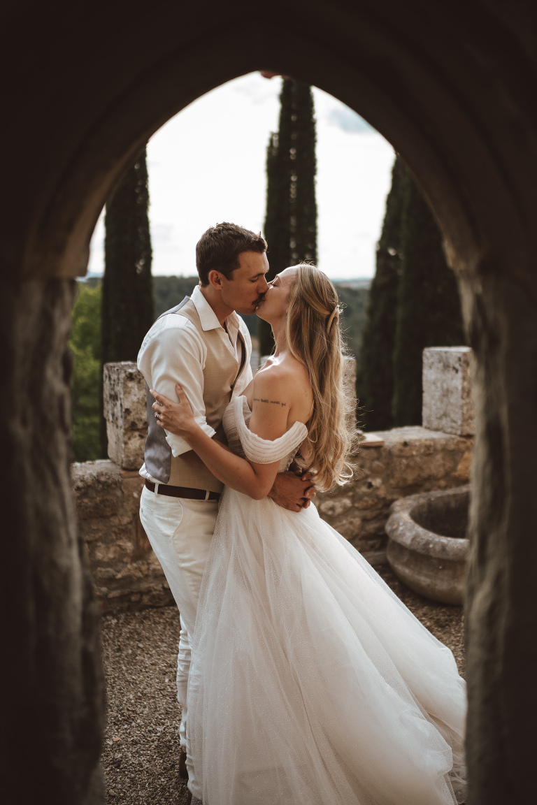 After the ceremony, we took advantage of the calm rhythm of the day for a relaxed couple photoshoot around the castle, before dinner. No stress, no pressure—just a walk, a few laughs, and time to enjoy being newly married. As always, Castello di Badia offered endless corners, textures, and views, making every frame feel unique.