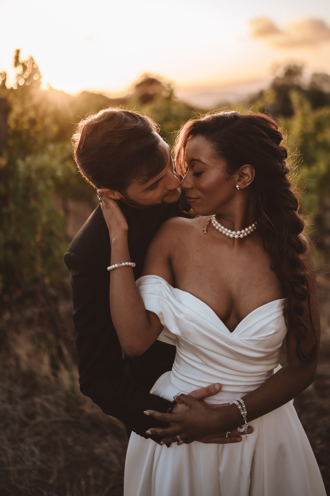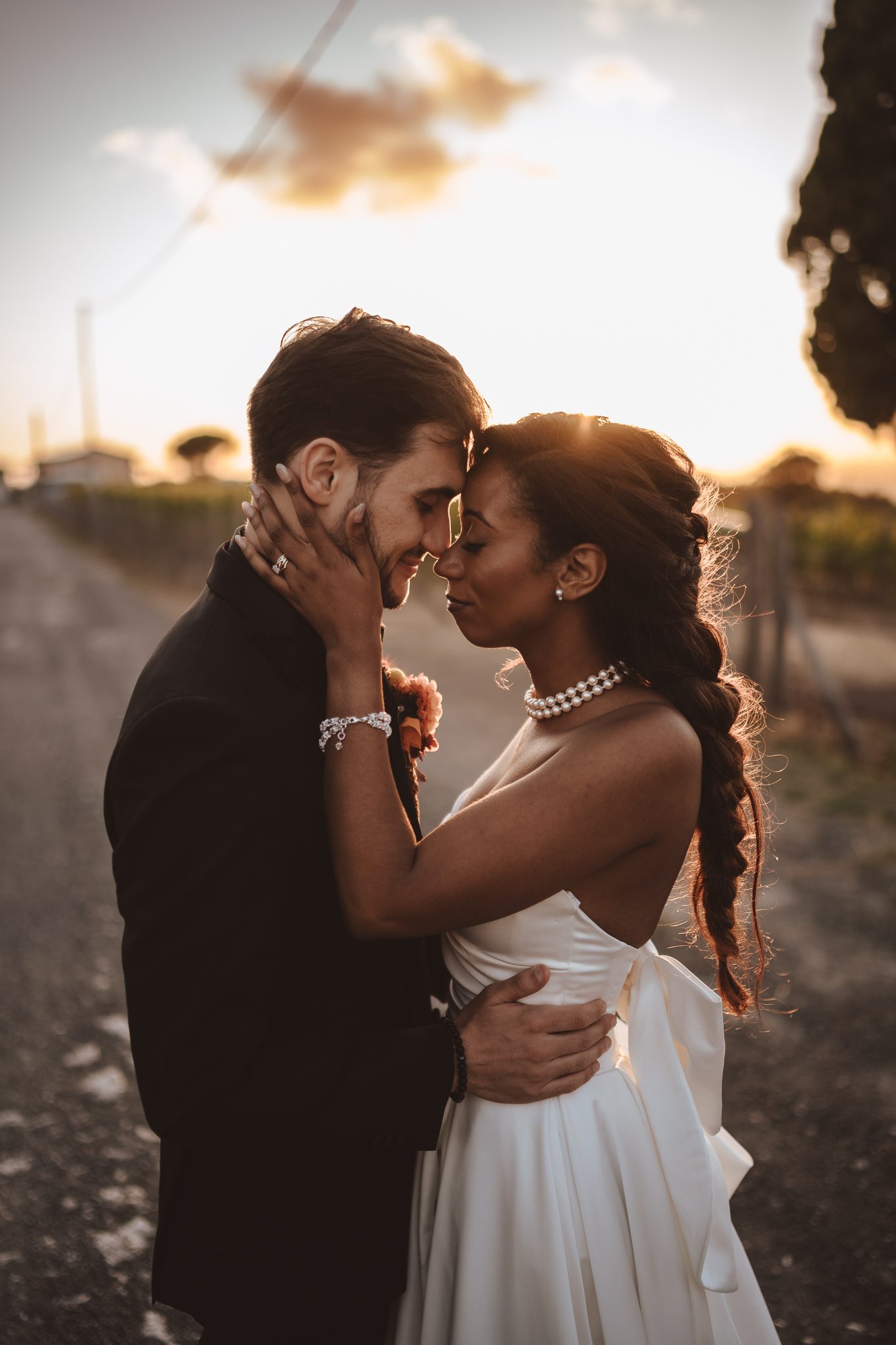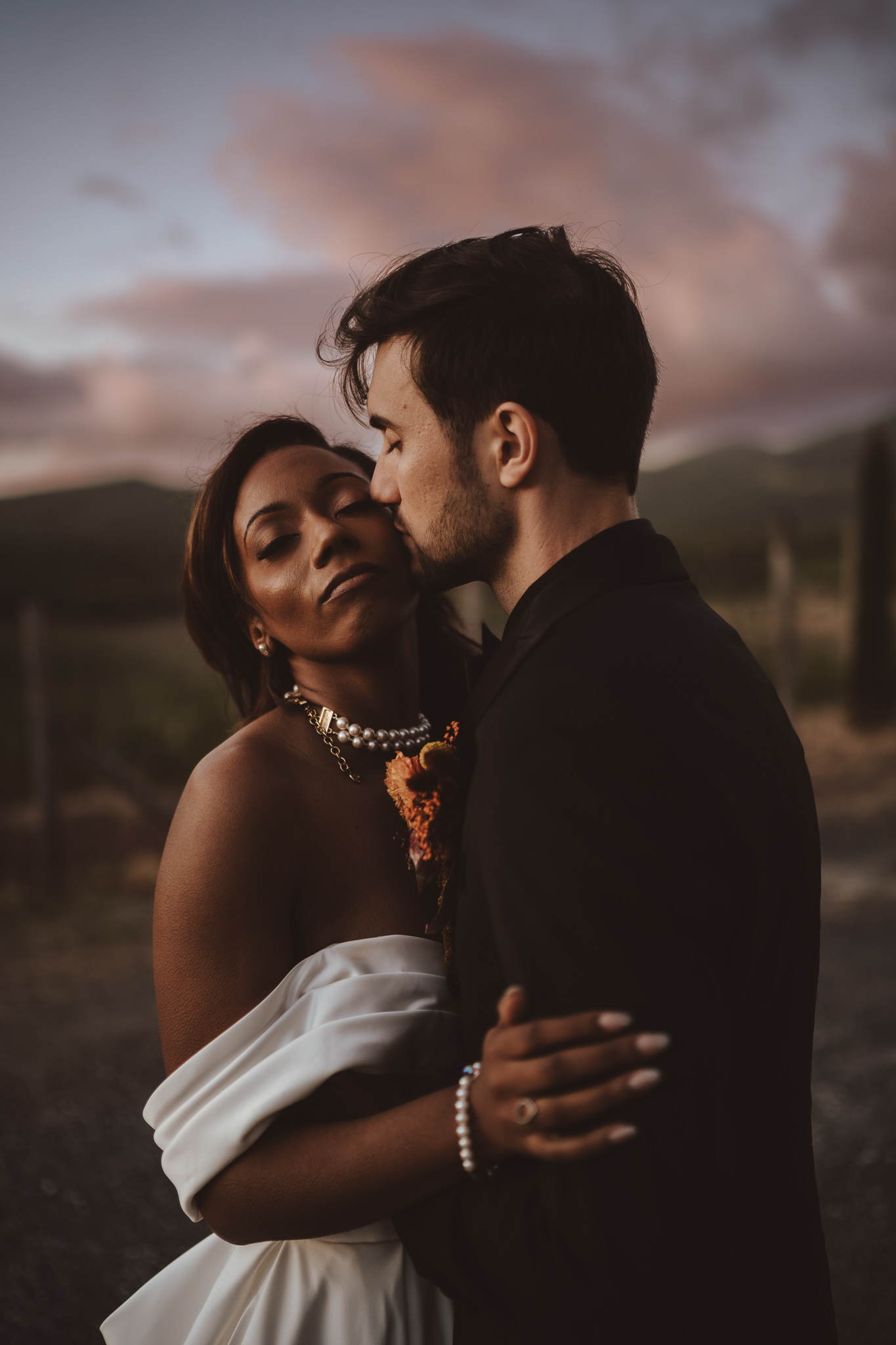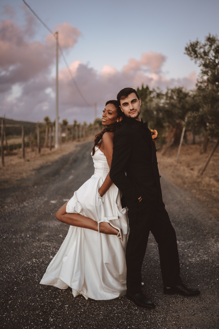 After the ceremony, we moved to the wedding venue in the Tuscan countryside. As often happens in Tuscany, the light slowly transformed throughout the afternoon, giving us the opportunity to create a complete photographic story. We started with soft sunset portraits and continued into a blue hour photoshoot, one of my favorite moments of any wedding day. These are the minutes when everything slows down and emotions emerge naturally, without pressure.