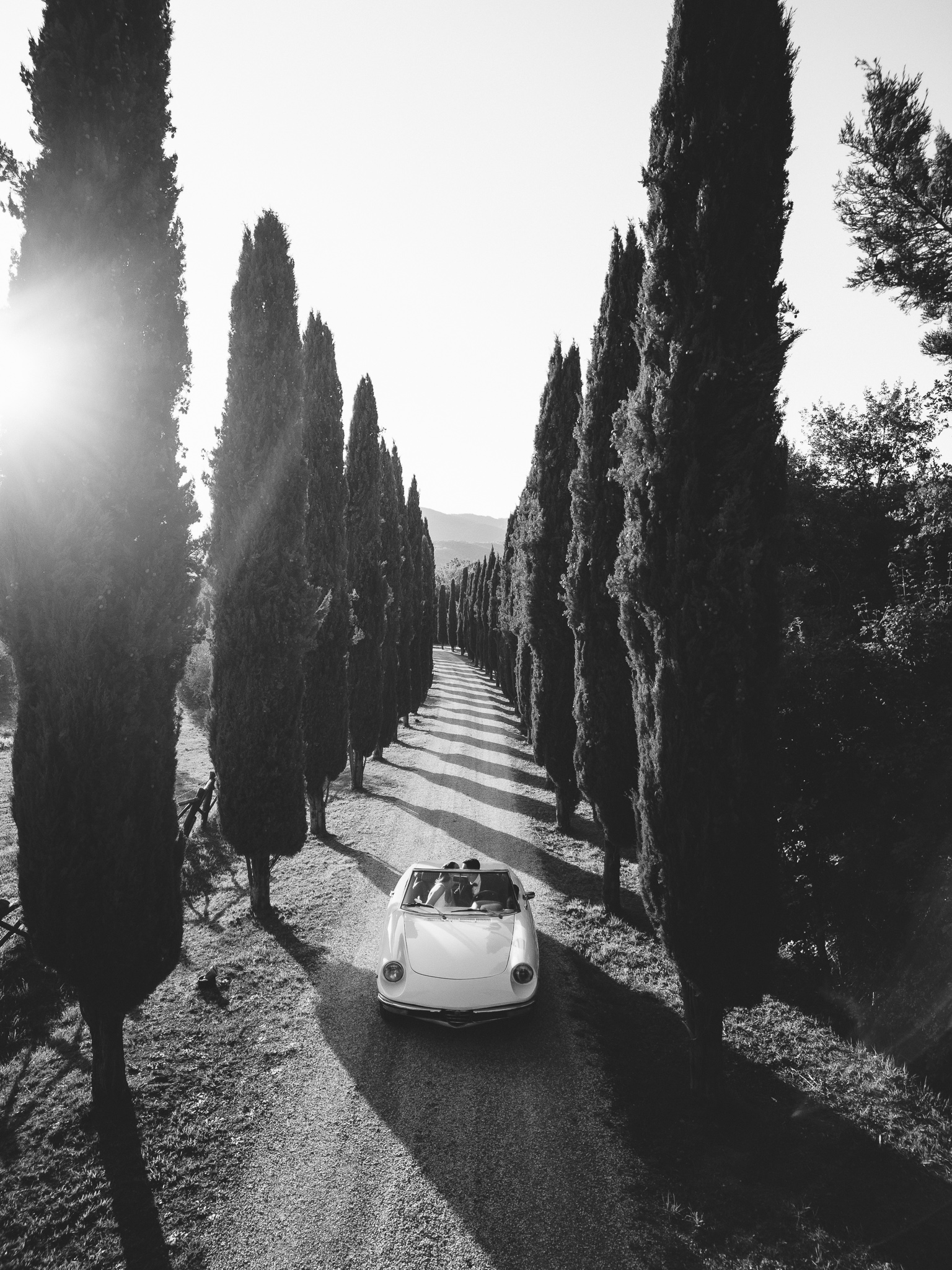 Because the schedule was full, and many things were planned before dinner, we anticipated the couple photoshoot. Light conditions were not the easiest but that’s where experience in Tuscany really matters. We mixed indoor spaces, shaded areas,and then moved to one of my favorite spots close to Buccelletti: a beautiful road lined with cypress trees. That stretch of road is a gift for photographers since the trees help soften the light and create a classic Tuscan atmosphere that works perfectly even in challenging conditions.