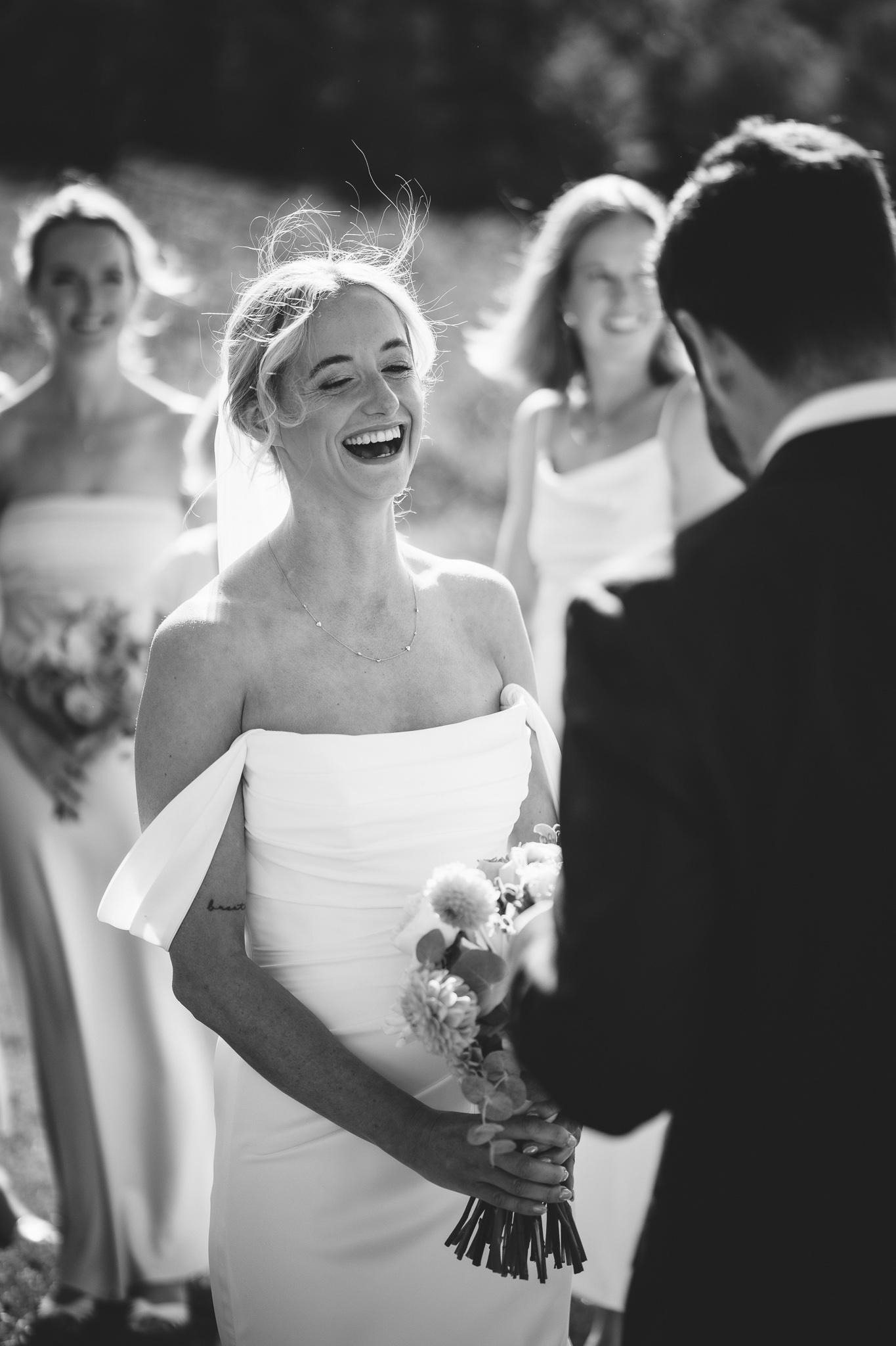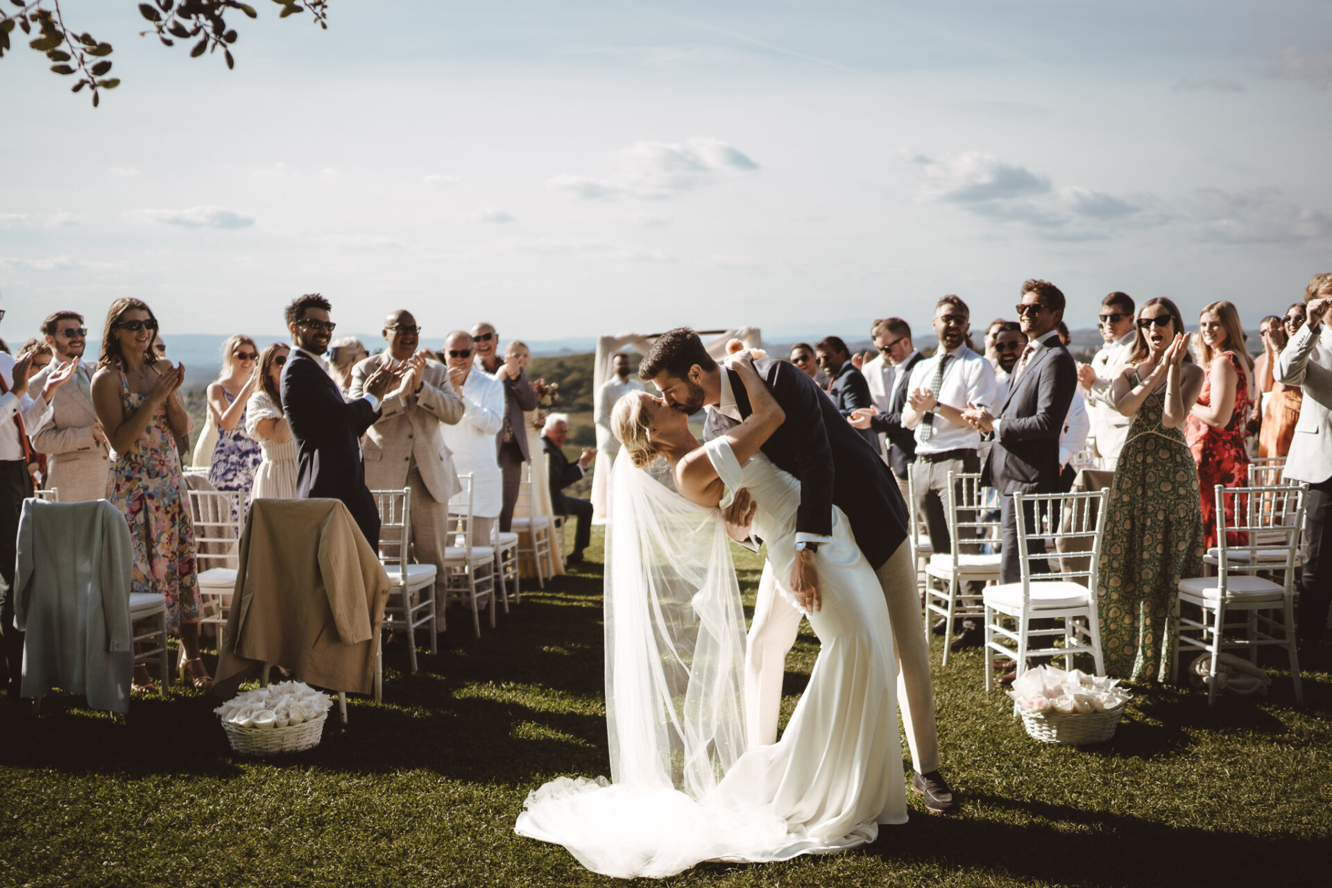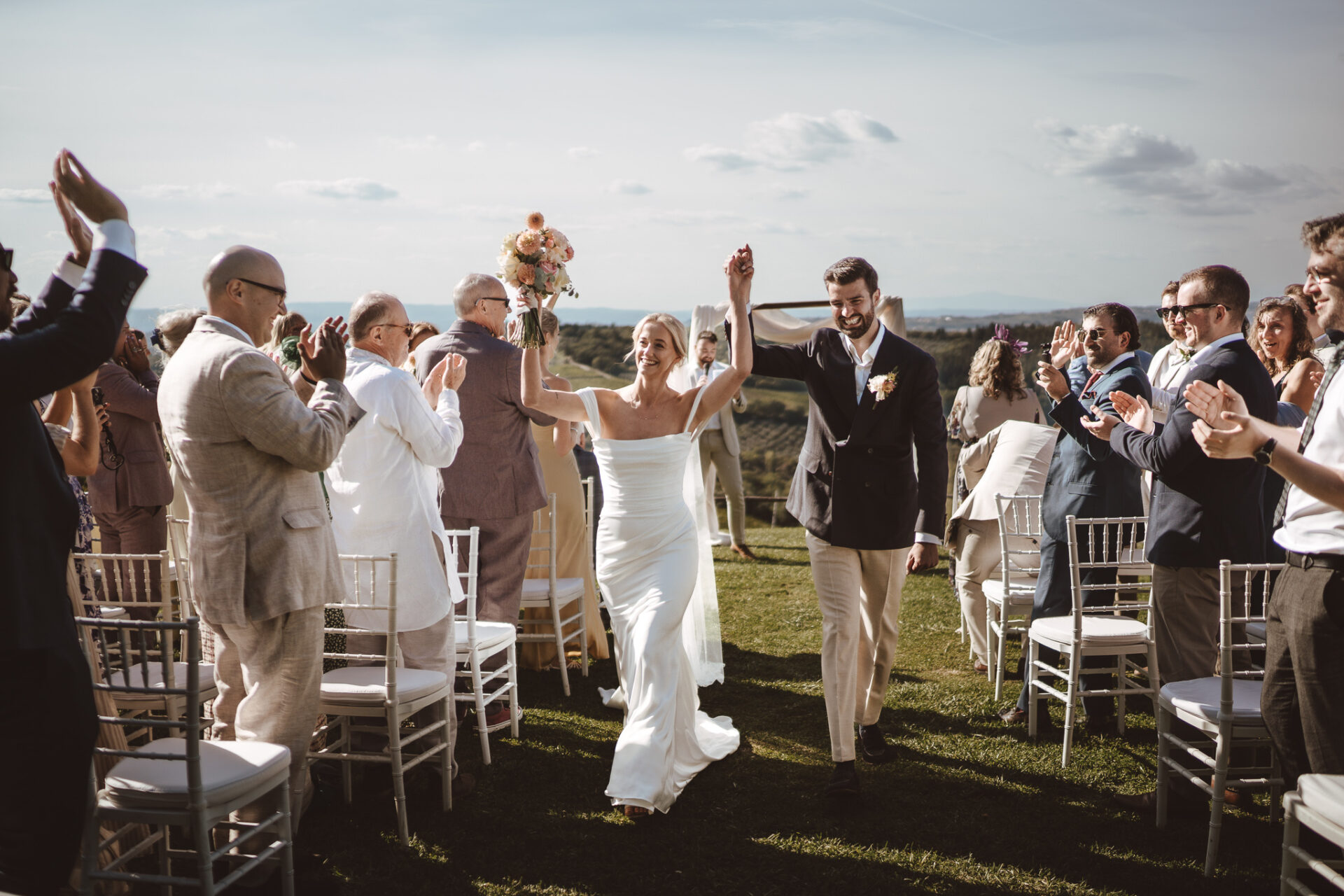 The ceremony took place outdoors, with the classic Chianti landscape stretching behind them. No need for anything complicated when you have that kind of view. The atmosphere was intimate, emotional and, above all, genuine.